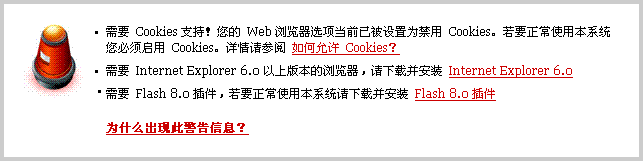 本系统在登录时候采用了先进的检测机制,可以自动判断客户端浏览器是否可以正常访问并使用本系统。如果在登录的时候检测到问题,系统将提示可能存在的问题和解决办法(如下图所示),用户可以参考提示屏幕提示解决这些问题。